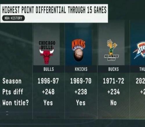 雷霆赛季前15场净胜232分排历史第四,前三仅一队未夺冠
